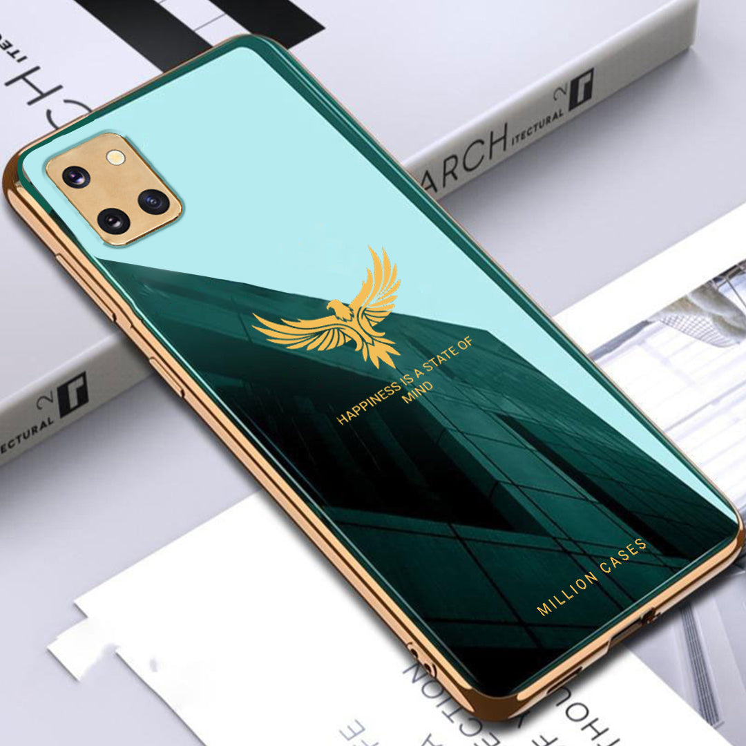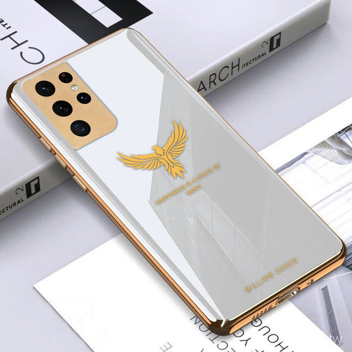 An Attractive Electroplating Glass case with a Popular Eagle Theme with an inspiring quote "HAPPINESS IS A STATE OF MIND " for your premium Smartphone. The frame of the phone case has been Galvanized around the Camera Lens and Border, which makes it Attractive.