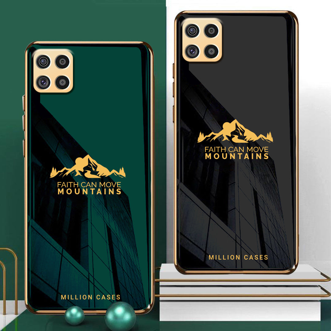 An Attractive electroplating glass case with a popular mountain theme that features a motivational quote "FAITH CAN MOVE MOUNTAINS" for your premium smartphone. The frame of the phone case is galvanized around the camera lens and the border, which makes it attractive.