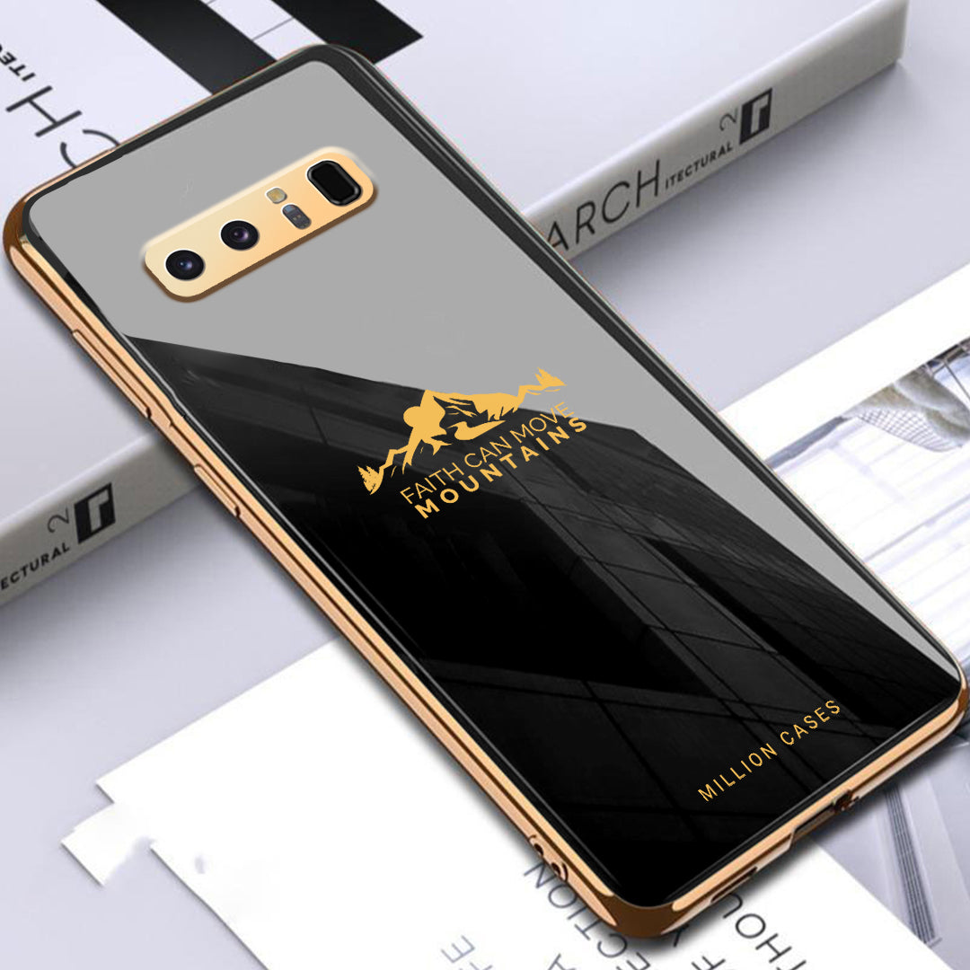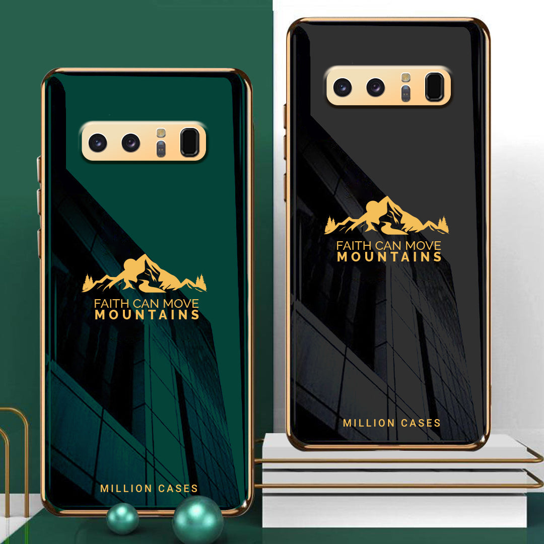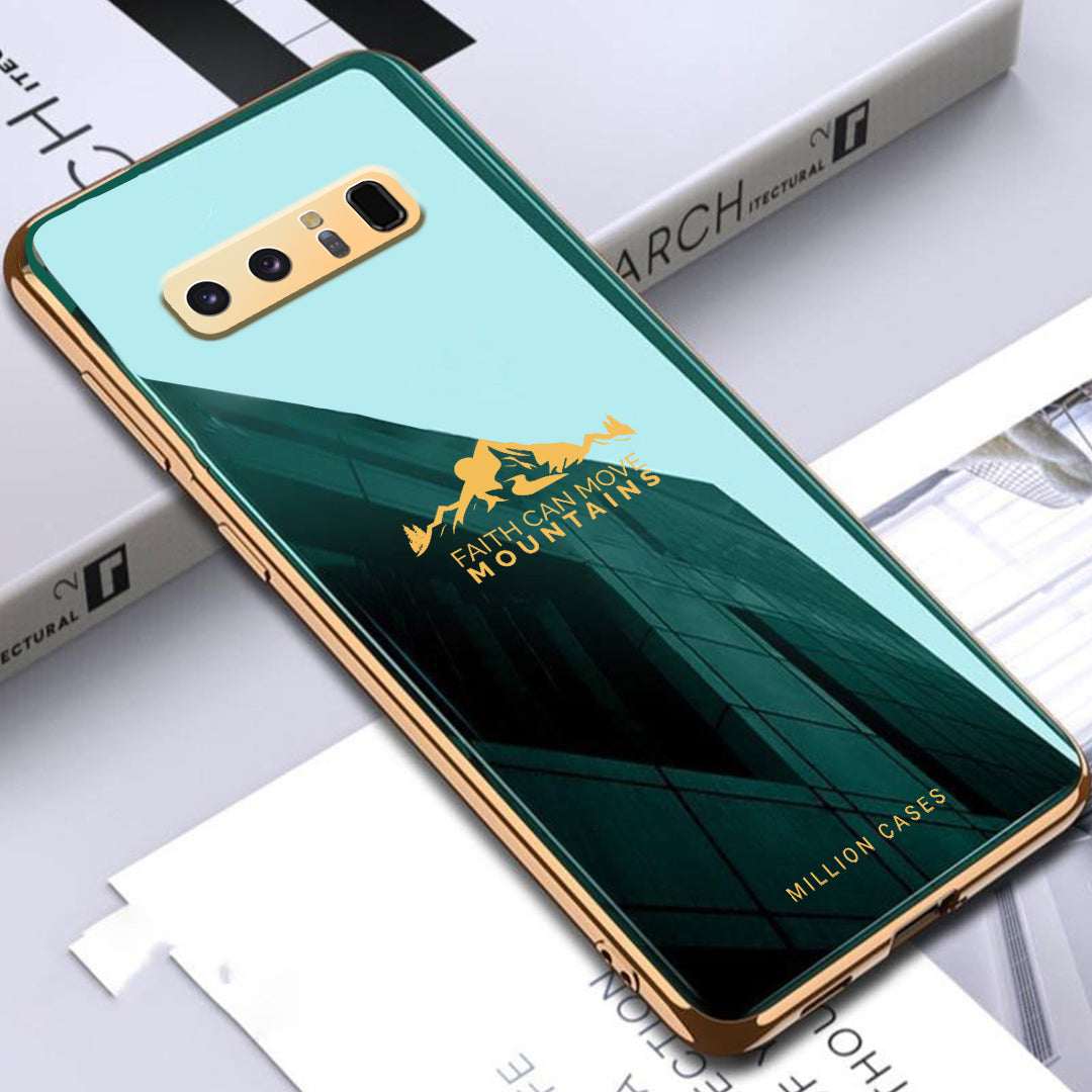 An Attractive electroplating glass case with a popular mountain theme that features a motivational quote "FAITH CAN MOVE MOUNTAINS" for your premium smartphone. The frame of the phone case is galvanized around the camera lens and the border, which makes it attractive.