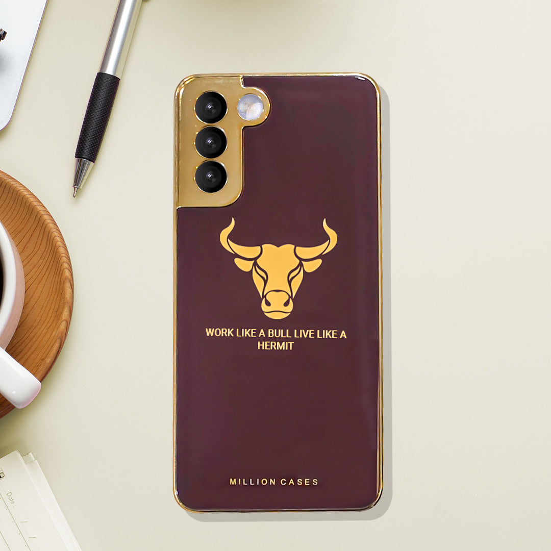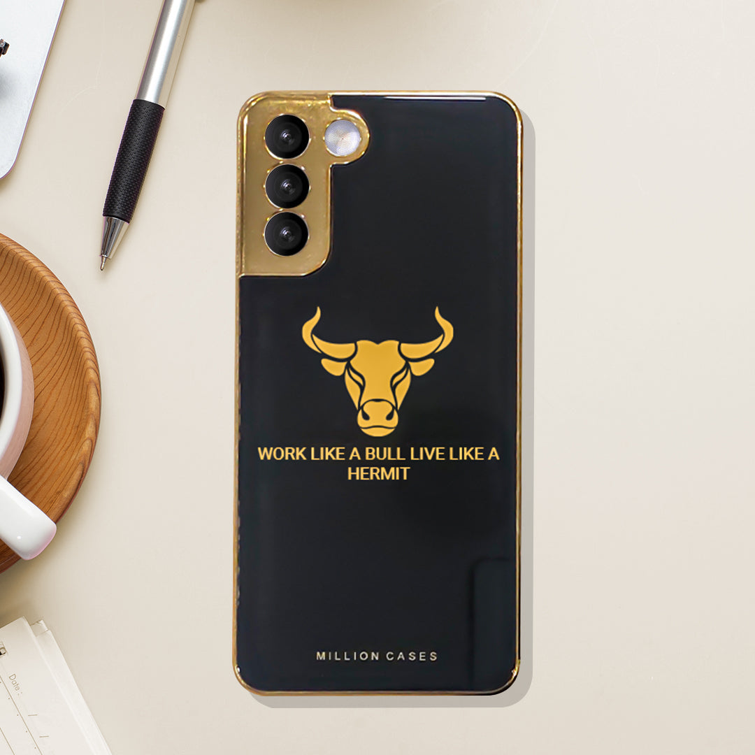 An Attractive Electroplating Glass case with a Popular BULL Theme with an inspiring quote "WORK LIKE A BULL LIVE LIKE A HERMIT " for your premium Smartphone. The frame of the phone case has been Galvanized around the Camera Lens and Border, which makes it Attractive.