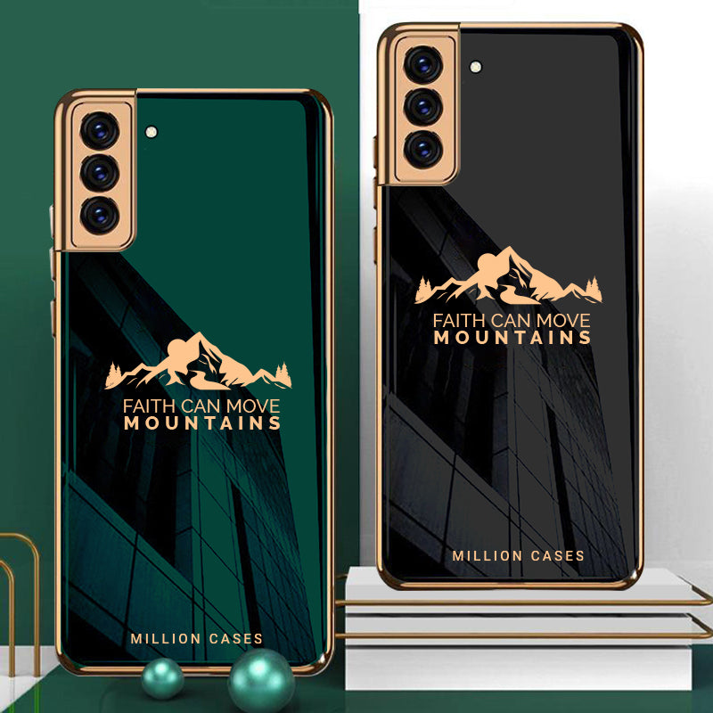 An Attractive electroplating glass case with a popular mountain theme that features a motivational quote "FAITH CAN MOVE MOUNTAINS" for your premium smartphone. The frame of the phone case is galvanized around the camera lens and the border, which makes it attractive.