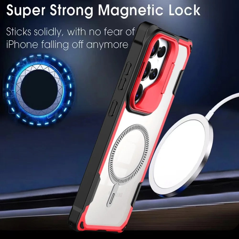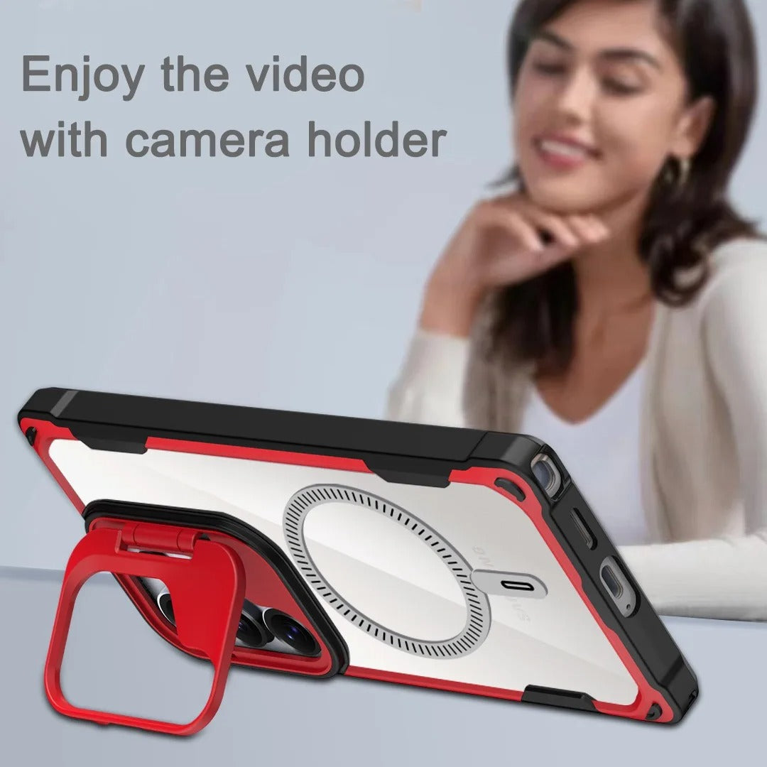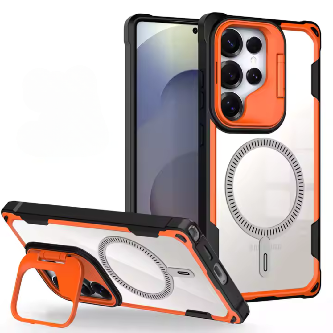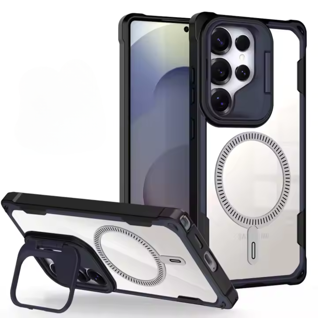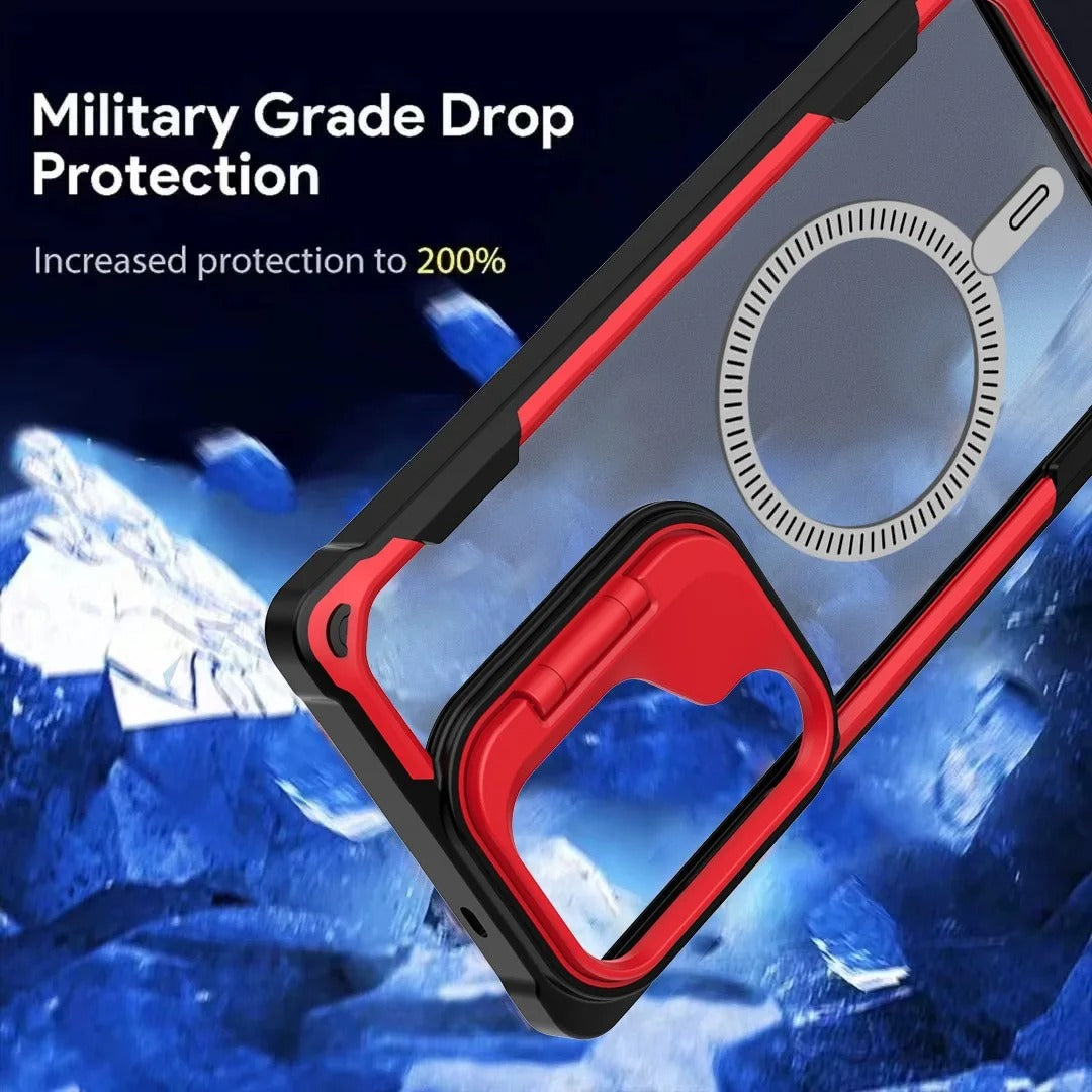 Unleash bold protection with a sleek, magnetic armor design. Crafted with a foldable lens stand, shockproof bumper, and a crystal-clear acrylic shield, this case is designed to deliver fearless style and flawless durability.