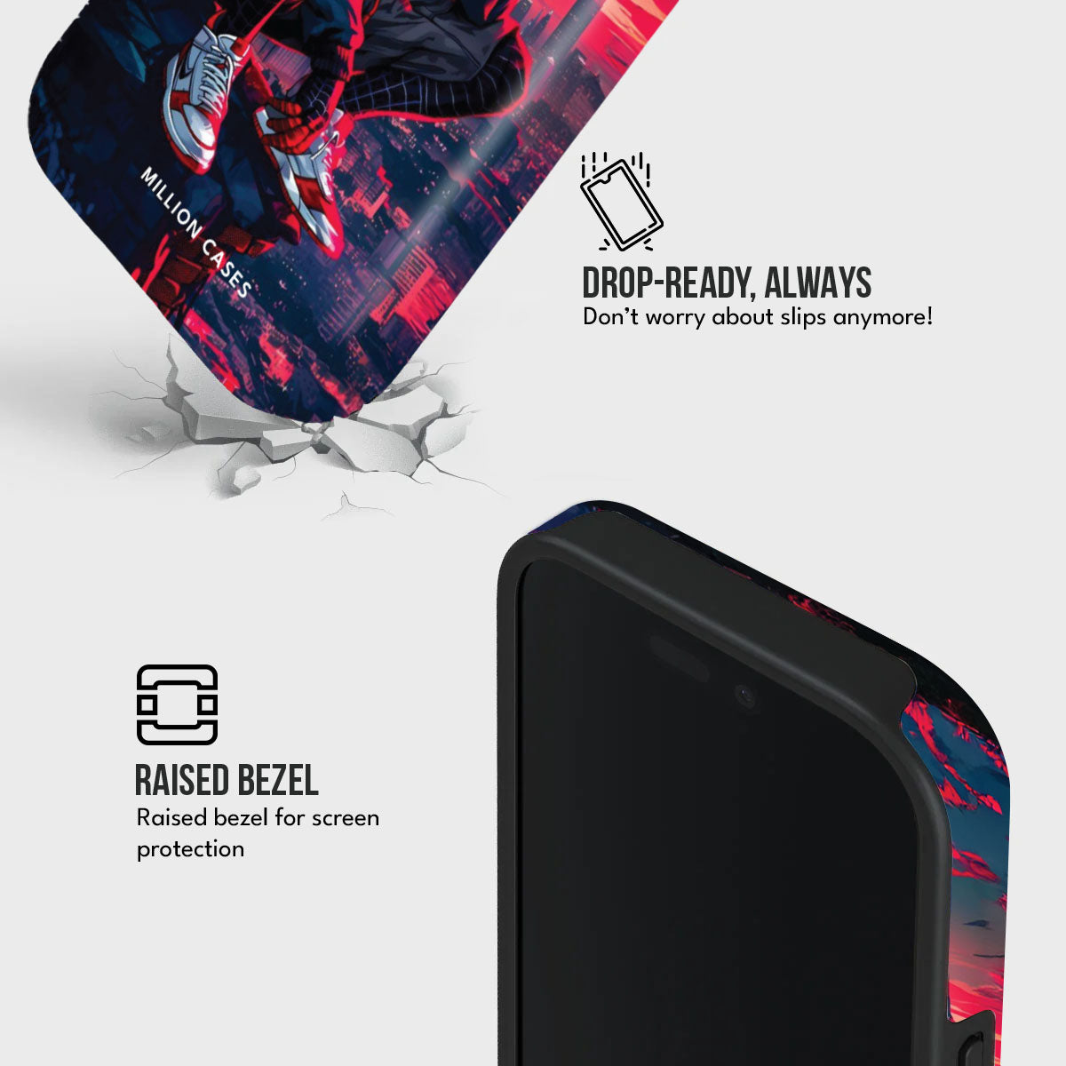 Step into the shadows with Hooded Hero — a tribute to the fearless vigilantes who watch over the city when the sun sets. Featuring a bold, neon-lit design inspired by urban legends and comic book grit, this case captures the essence of a lone hero ready to rise.