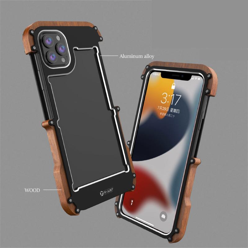 iPhone 13 Series R-Just Aluminium & Natural Wood Anti-shock Bumper Case